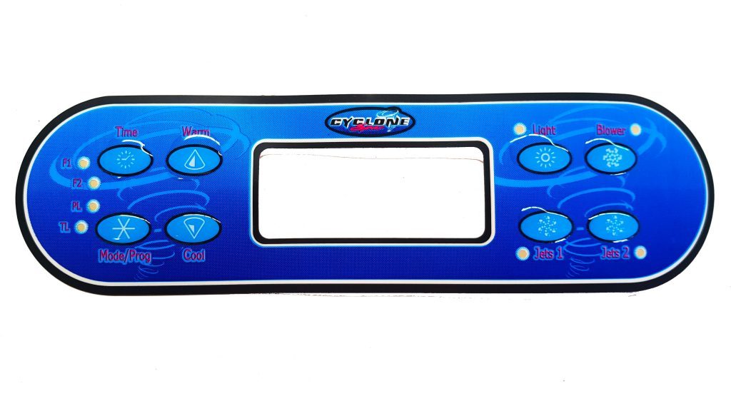 Button configuration Time, Warm, Mode, Cool are on the left side of the screen and Light, Blower, Jets 1, Jets 2 are on the right hand side of the screen.